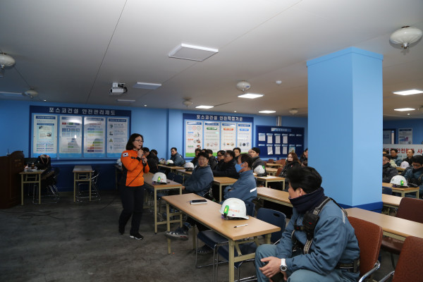 서울 영등포소방서는 지난 23일 오후 포스코건설 여의도파크원 공사현장을 찾아 직원 60명을 대상으로 '시민안전파수꾼 교육'을 실시했다. 사진은 소방관이 응급처치 방법에 대해 설명하는 모습. (사진제공=영등포소방서)