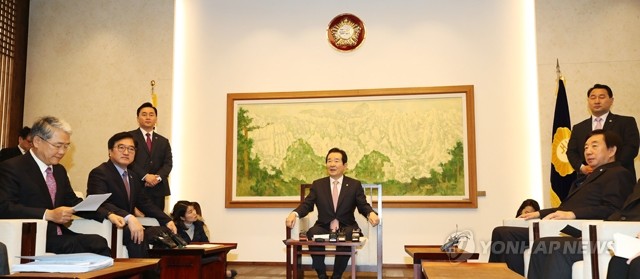 정세균 국회의장과 여·야 3당 원내대표가 26일 오전 국회의장실에서 회동하고 있다. 왼쪽부터 바른미래당 김동철 원내대표, 더불어민주당 우원식 원내대표, 정세균 국회의장, 자유한국당 김성태 원내대표.
