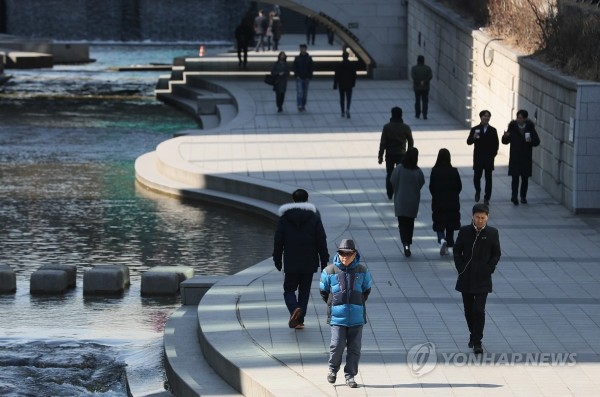 서울 낮기온이 9도까지 오르며 한층 포근해진 26일 오후 서울 청계천에서 시민들이 점심시간을 이용해 산책을 하고 있다.