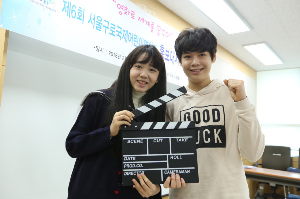 26일 서울 구로구가 구청 소통홀에서 ‘제6회 구로국제어린이영화제’ 홍보대사로, 김지영양(12)과 정윤석군(14)을 위촉했다. 이들은 영화제 기간 개막식 등의 주요 행사에 참석하고, 홍보 모델 등으로 활동하게 된다. (사진제공=구로구청)