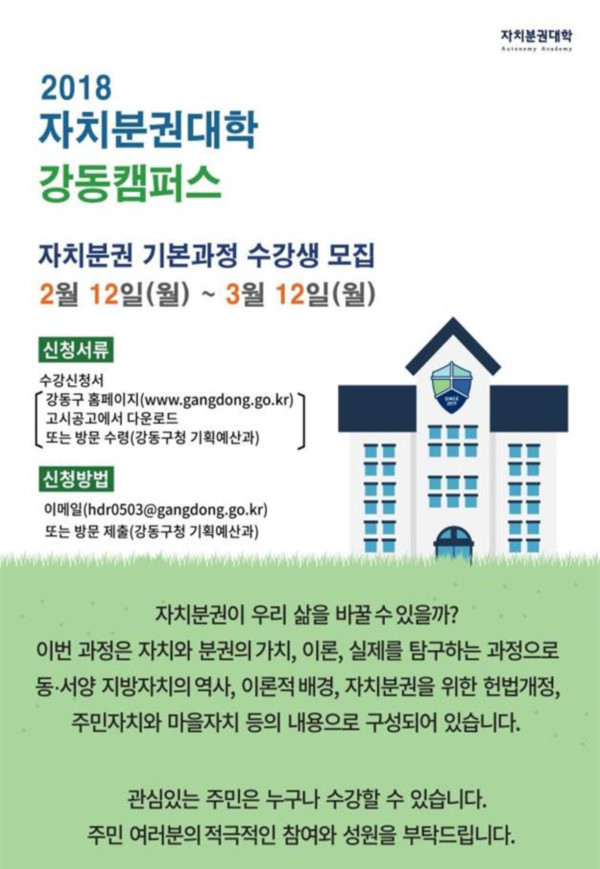 [시민일보=이대우 기자] 서울 강동구가 오는 3월12일까지 ‘2018 자치분권대학 강동캠퍼스’ 수강생을 모집한다.