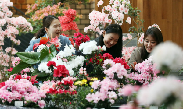 27일 서울 서초구청 로비에서 열린 봄꽃 직거래 장터에서 시민들이 활짝 핀 봄꽃을 살펴보고 있다.