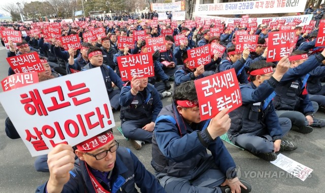 27일 오후 전북 군산시청 앞에서 열린 '한국GM 군산공장 폐쇄 철회 노조 결의대회'에서 노동자들이 구호를 외치고 있다.