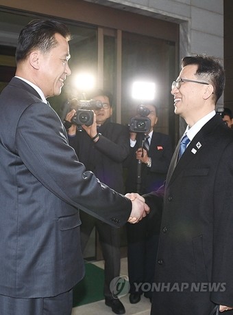 남북은 27일 오전 판문점에서 북한의 평창동계패럴림픽 참가를 논의하기 위한 실무회담에 돌입했다. 우리측 수석대표인 이주태 통일부 교류협력국장(오른쪽)과 북측 단장인 황충성 조국평화통일위원회 부장이 회담에 앞서 악수하고 있다.