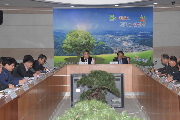 경기 동두천시가 27일 시청 상황실에서 시장·간부 공무원 20여명과 함께 2018년 주요 현안사업 보고회를 열고 1분기 사업 추진경과 보고를 실시했다. 사진은 보고회 진행 중인 모습. (사진제공=동두천시청)
