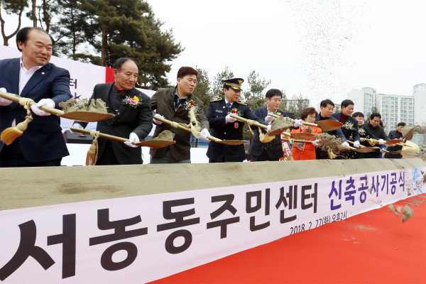 경기 용인시는 지역내 31개 읍·면·동 가운데 유일하게 자체 청사가 없던 기흥구 서농동에 북카페와 헬스장 등을 갖춘 최신식 청사를 건축하기로 하고, 27일 ‘서농동 주민센터 기공식’을 개최했다. 사진은 관계자들이 시삽식을 하는 모습. (사진제공=용인시청)