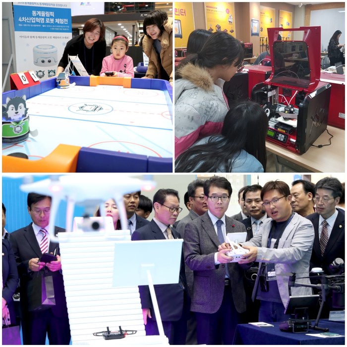 | ▲ (위로부터 시계방향으로) 최근 진행 중에 있는 ‘동계올림픽 4차 산업혁명 로봇 체험전’에서 로봇 아이스하키에 참여한 어린이와 학부모의 모습, 성동 4차 산업혁명 체험센터 ‘3D 프린팅 체험시설’을 방문한 청소년들의 모습, ‘성동 4차 산업혁명 체험센터’를 방문한 구청 관계자들이 드론 전문가의 지도를 받아 드론을 조종하고 있는 모습.(사진제공=성동구청) | ||