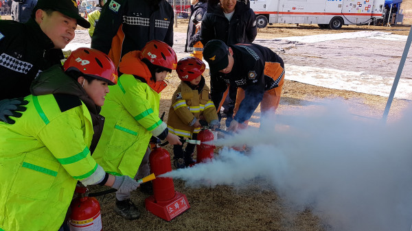 경기 오산소방서는 1일 오산시에서 주최한 2018년 정월대보름 행사장에서 소방안전체험부스를 운영했다. 사진은 참여자들이 소화기 사용 실습을 하고 있는 모습. (사진제공=오산소방서)
