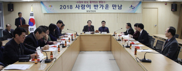경기 수원시 팔달구는 지난 28일 구청 상황실에서 팔달연합회 회원 15명이 참석한 가운데 2월중 만남의 시간을 가졌다. 사진은 참여자들이 회의하고 있는 모습. (사진제공=팔달구청)