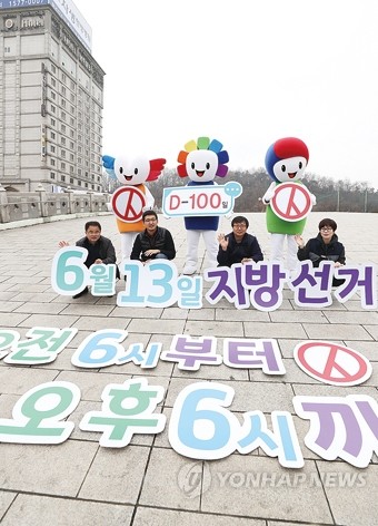 제7회 전국동시지방선거를 101일 앞둔 4일 오전 경기도 수원시 영통구 직녀광장에서 경기도선거관리위원회 직원들이 지방선거 홍보 활동을 하고 있다.
