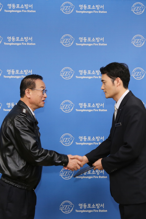 영등포소방서는 5일 오전 3층 소회의실에서 근속 승진자 2명과 전입자 1명에 대한 임용장 수여식을 가졌다. 사진은 소방서장이 승진자와 악수를 하고 있는 모습. (사진제공=영등포소방서)