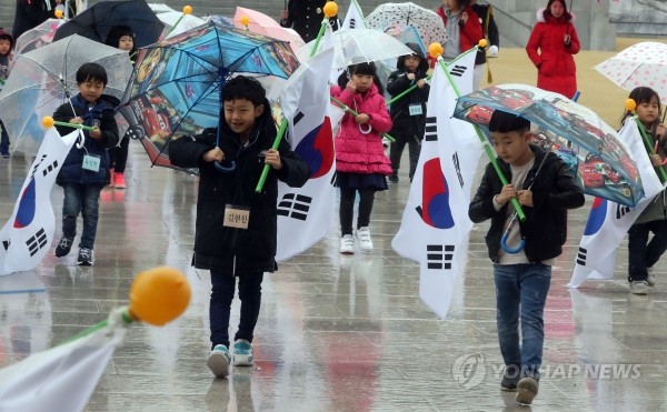 5일 대전 유성구 국립대전현충원에서 대전 화정초등학교 1학년 학생들이 초등학교 첫 수업을 겸해 현충탑을 참배하고서 태극기를 들고 나서고 있다. 이 학교는 신입생에게 나라사랑 마음을 심어주기 위해 입학 후 첫 수업으로 현충원 방문 행사를 진행하고 있다.