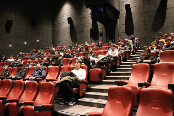 경기 하남소방서는 최근 스타필드 메가박스 영화관에서 소방공무원과 사회복무요원 70여명이 참석한 가운데 이색적인 직장교육을 실시했다. 사진은 참여자들이 영화 관람에 앞서 내부소통·화합을 위한 서장 특별교육에 집중하는 모습. (사진제공=하남소방서)