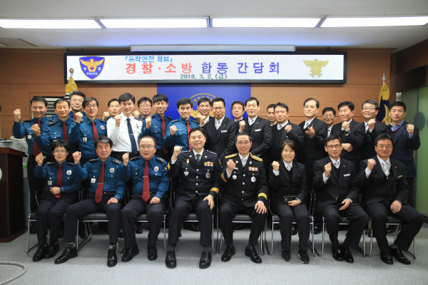서울 동작소방서는 지난 2일 오전 11시 동작경찰서에서 소방-경찰 합동 간담회를 개최했다. 사진은 간담회가 끝난 후 관계자들이 기념촬영을 하고 있는 모습. (사진제공=동작소방서)