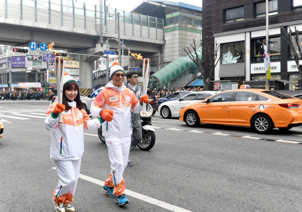 4일 서울 광진구에서는 오는 9~18일 개최되는 ‘2018 평창 동계패럴림픽’을 밝힐 성화봉송행사가 열렸다. 사진은 구 성화봉송 구간인 건대입구역 사거리에서 첫 번째 성화봉송 주자들이 성화를 들고 달리는 모습. (사진제공=광진구청)