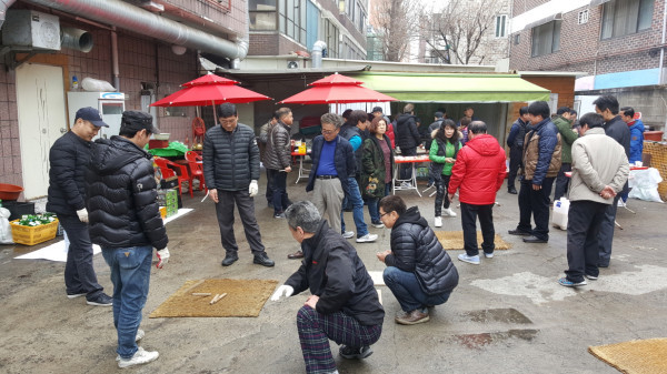 경기 수원시 영통구 매탄4동 산드래미 상가번영회는 4일 정월대보름을 맞이해 매탄4동의 지역경제 번영과 주민 화합을 기원하며 '척사대회'를 개최했다. 사진은 참여자들이 윷놀이를 하는 모습. (사진제공=영통구청)