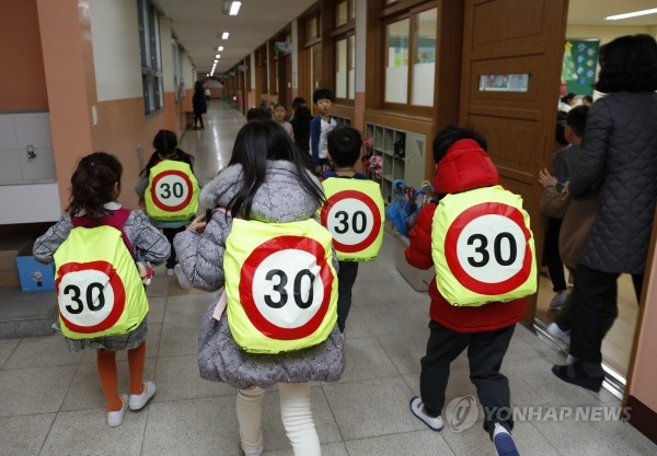 행정안전부, 경상북도 포항교육지원청, BGF리테일이 5일 오전 경북 포항 한 초등학교에서 학생들에게 '생활 안전 가방 덮개'를 선물하고 안전 교육을 하고 있다. 이 덮개는 학생들 책가방에 씌울 수 있게 제작해 어두울 때도 운전자들이 스쿨존 제한속도를 확인할 수 있도록 했다.