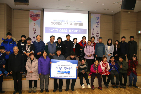 최근 경기 양평군장애인복지관은 (재)남궁앤강기념재단의 후원으로 양평지역내 저소득 취약계층 장애인 가구를 위한 ‘2018년 소원을 말해봐’ 후원금을 전달 받았다. 사진은 후원금 전달식 후 관계자들이 기념촬영을 하는 모습. (사진제공=양평군청)