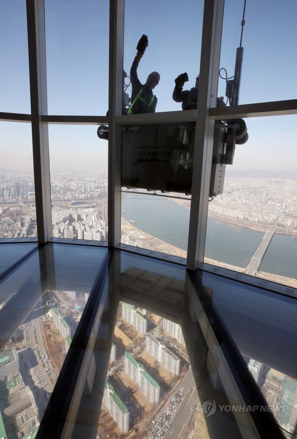 경칩인 6일 오전 서울 송파구 롯데월드타워에서 전문 고소작업자들이 유리 외벽을 청소하고 있다.