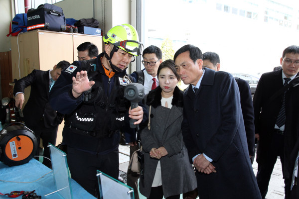6일 오후 2시 베트남 소방방재청장을 비롯한 베트남 소방 대표단 8명이 재난안전 분야 기술과 우수 정책사례 탐방을 위해 은평소방서를 방문했다. 사지은 소방관이 베트남 소방 대표단에게 첨단 구조·구급 장비에 대한 설명을 하는 모습. (사진제공=은평소방서)