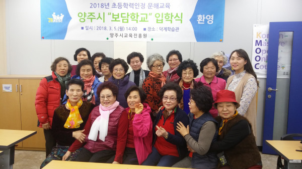 경기 양주시는 지난 5일 초등학력이 인정되는 ‘보담학교’의 입학식을 덕계학습관에서 개최했다. 사진은 입학식 후 관계자들이 기념촬영을 하고 있는 모습. (사진제공=양주시청)