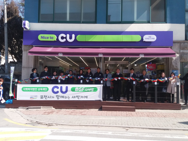 경기 포천지역자활센터는 6일 사회적 취약계층의 고용과 창업을 지원하는 편의점 사업단에 운영하는 씨유(CU) 편의점 ‘새싹가게’의 개업식을 개최했다. 사진은 행사에 참여한 관계자들이 테이프 커팅을 하고 있는 모습. (사진제공=포천시청)