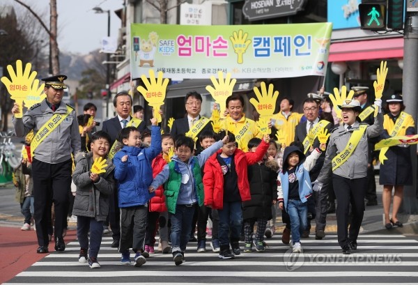 서울재동초등학교 1학년생들과 이주민 서울지방경찰청장(왼쪽), 박희종 세이프키즈코리아 대표, 정한주 교장 등이 7일 오전 서울 종로구 재동초등학교 인근에서 노란색 손모양 피켓을 들고 어린이 교통사고를 예방하기 위한 '엄마손 캠페인'을 하며 횡단보도를 건너고 있다.