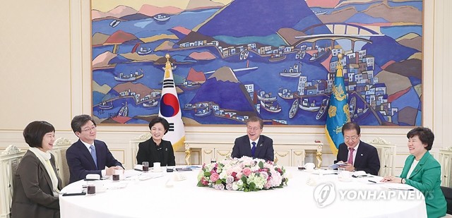 문재인 대통령이 7일 오후 청와대에서 여야 대표들과 오찬 회동에서 대화를 나누고 있다. 왼쪽부터 정의당 이정미 대표, 바른미래당 유승민 공동대표, 더불어민주당 추미애 대표, 문 대통령, 자유한국당 홍준표 대표, 민주평화당 조배숙 대표.