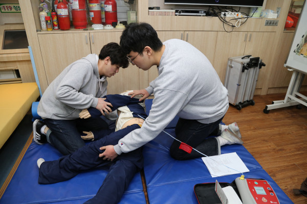 8일 서울 영등포소방서가 ‘제7회 전국 일반인 심폐소생술 경연대회’에 출전할 수 있는 서울대표 선발대회를 위해 심정지 발생 상황과 대처 행동을 짧은 연극 형식으로 준비했다. 사진은 전문 강사의 지도 아래 교육을 받고 있는 대학생 대표 팀의 모습. (사진제공=영등포소방서)