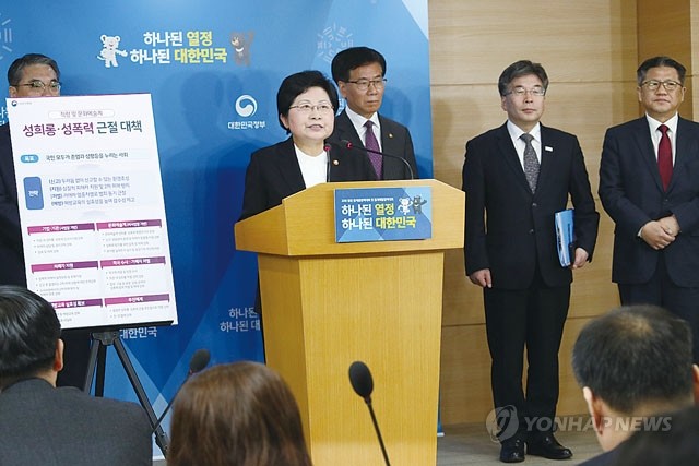 정현백 여성가족부 장관이 8일 오전 서울 세종로 정부서울청사에서 '직장 및 문화예술계 성희롱·성폭력 근절 대책'을 정부 합동으로 발표하고 있다.