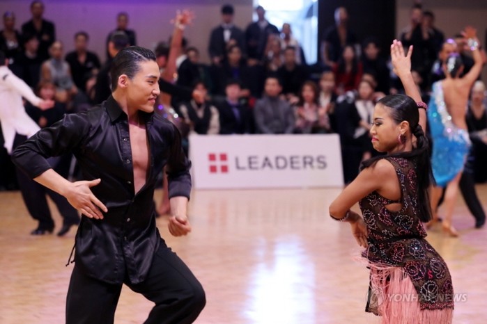 | ▲ ‘2018 코리아 오픈 댄스스포츠 월스챔피언쉽’의 아시권 프로패셔널 라틴댄스 부문에서 1등을 수상한 김민제·함예빈 선수가 대회에 참여하고 있는 모습.(사진제공=연합뉴스) | ||