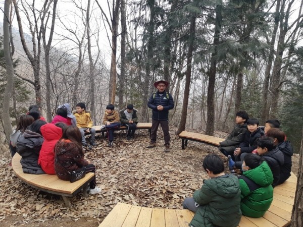 전남 진도군 드림스타트에서 최근 1박2일 일정으로 국립장성숲체원에서 운영 중인 ‘나눔의 숲 캠프’에서 숲 체험을 실시했다. 사진은 어린이들이 숲 해설가의 설명을 듣고 있는 모습.(사진제공=진도군청)