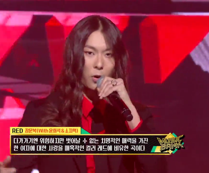 장문복은 9일 방송된 '뮤직뱅크'에서 미니앨범 'Peeps'의 타이틀곡 'RED'로 무대를 장식했다. 장문복은 붉은색 셔츠에 검은색 타이를 메고, 블랙톤의 자켓을 입고 무대에 올랐다. 전매특허인 장문복의 랩과 함께 윤희석, 소지혁과의 케미가 무대의 완성도를 높였다.
