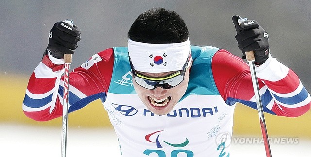 11일 강원도 평창 바이애슬론센터에서 열린 2018평창패럴림픽 크로스컨트리 남자 15km 좌식경기에서 동메달을 차지한 한국 신의현이 피니시라인을 향해 질주하고 있다.