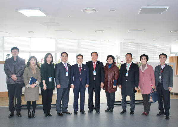 | ▲ 환경부를 방문한 위례신도시건설 현안문제 개선 특별위원회 위원들이 기념촬영을 하고 있다.(사진제공=송파구의회) | ||