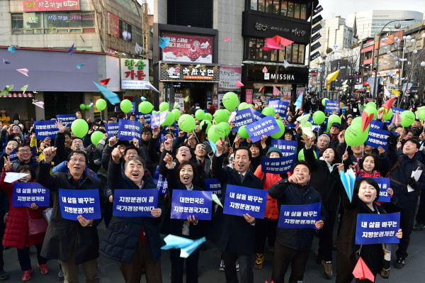 서대문구는 본격적인 개헌 정국을 맞아 자치분권 공감대를 확산하기 위해 최근 신촌 연세로에서 자치분권개헌 버스킹을 개최했다. 사진은 자치분권 염원을 담아 종이비행기를 날리는 행사 참가자들의 모습. (사진제공=서대문구청)