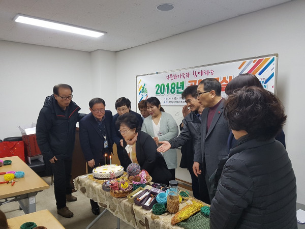 인천 계양구 계산2동은 지난 9일 주민센터 소회의실에서 결혼이민자 15명, 계산2동 주민자치위원 등 20여명이 참석한 가운데 '무료 공예교실 개강식'을 열고 8개월간의 교육 일정에 들어갔다. 사진은 참여자들이 개강식 축하행사를 진행하는 모습. (사진제공=계양구청)