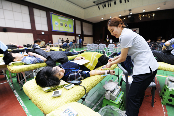 동대문구 공무원들이 최근 구청 강당에서 ‘2018 생명나눔 사랑의 헌혈 운동’에 동참했다. 이번 헌혈 운동에는 구청·동주민센터·공단 직원 외에도 사회복무요원, 비정규직근로자도 참여했다. 사진은 직원이 헌혈을 하고 있는 모습. (사진제공=동대문구청)