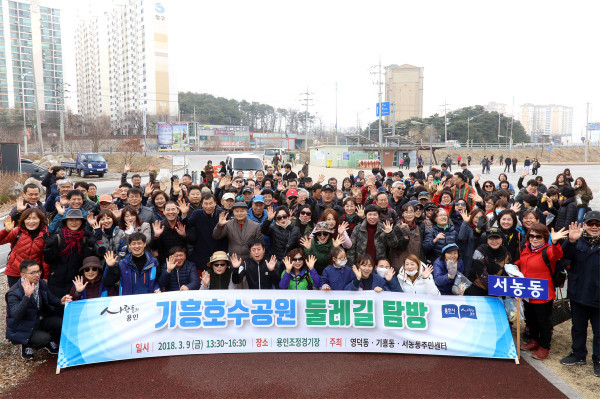 경기 용인시는 지난 9일 기흥호수공원 순환산책로를 시민의 눈높이에서 점검하고, 널리 알린다는 취지에서 기흥·서농·영덕동 지역주민들이 참석한 가운데 ‘기흥호수 둘레길 탐방행사’를 진행했다. 사진은 행사에 참여한 관계자들이 기념촬영을 하는 모습. (사진제공=용인시청)