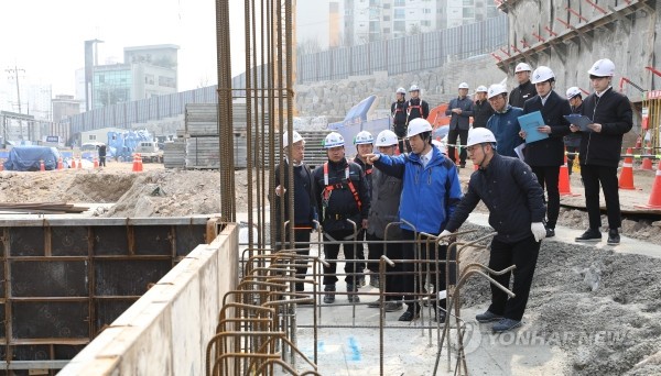 12일 오후 문석진 서대문구청장과 민간전문가들이 홍은동 주택 재개발 공사현장에서 해빙기 민관 합동 안전점검을 하고 있다.