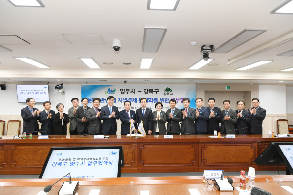 12일 경기 양주시가 강북구와 시청 상황실에서에서 문화·관광과 지역경제 활성화를 위한 상생 우호협약을 체결했다. 사진은 양주시장과 강북구청장, 관계자들이 협약 후 기념촬영을 하고 있는 모습. (사진제공=양주시청)