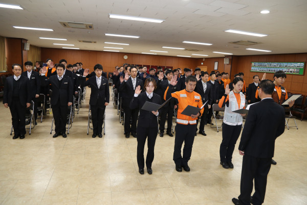 영등포소방서는 13일 대강당에서 청렴선포식을 가졌다. 이날 행사는 자발적이고 체계적인 부패예방 노력과 실천을 위해 청렴자율준수담당관 임명과 전담 TF를 구성하고, 결의문을 통해 청렴 소방 구현을 위한 실천 결의를 다졌다. 사진은 직원들이 선서를 하는 모습. (사진제공=영등포소방서)