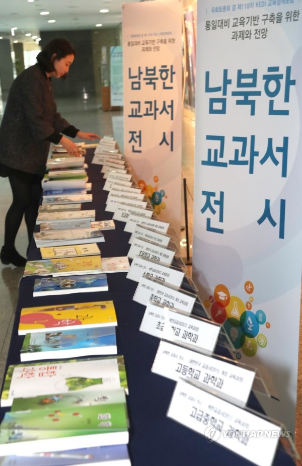 12일 오후 국회 의원회관에서 열린 '통일대비 교육기반 구축을 위한 과제와 전망' 토론회장 앞에서 남북한 교과서가 전시되고 있다.