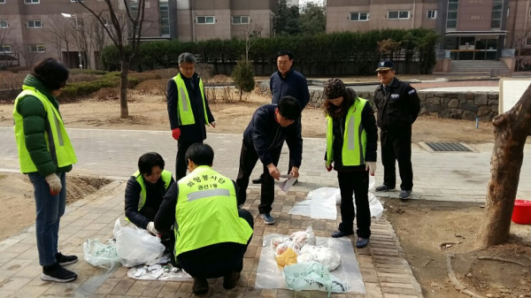경기 수원시 권선구 권선1동은 올바른 쓰레기 배출문화 정착을 위해 12일 동산아파트 및 권선SK뷰 아파트를 대상으로 '생활쓰레기 성상분석'을 실시했다. 사진은 참여자들이 쓰레기봉투를 파봉하고 분리배출 실태를 점검하는 모습. (사진제공=권선구청)