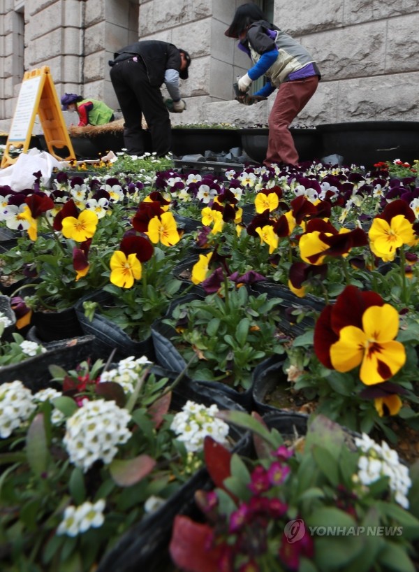 서울 낮 최고기온이 17도까지 오를 것으로 예상된 13일 서울 태평로 서울광장에서 작업자들이 화단에 팬지 등 봄꽃을 심고 있다.