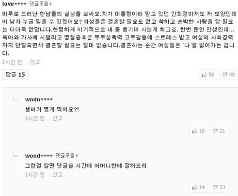 한 누리꾼은 그녀에게 "미투로 드러난 한남들의 실상을 보세요. 차기 대통령이라 믿고 있던 안희정마저도 저 모양인데 이 남자 누굴 믿을 수 있겠어요?"라며 "여성들은 결혼할 필요도 없고 착하고 순박한 사랑을 할 필요는 더더욱 없답니다"라고 적었다.