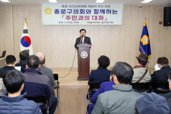 [시민일보=이대우 기자] 서울 종로구의회가 최근 가회동주민센터 강당에서 북촌 지구단위계획 재정비 사업과 관련, ‘주민과의 대화’를 열고 주민의견을 수렴했다.