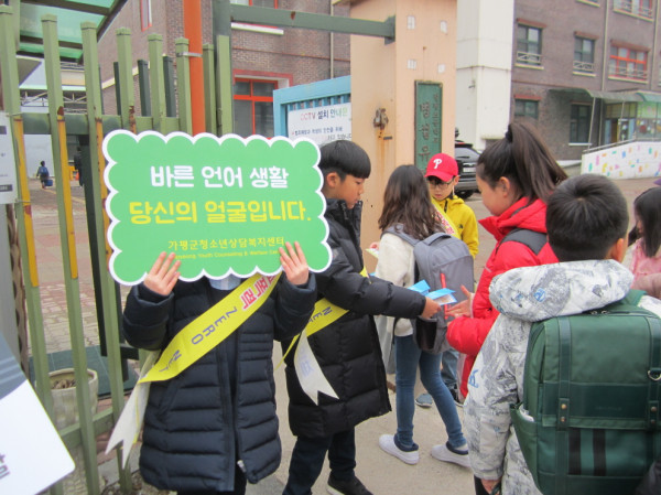 지난 12일 경기 가평군 청평초등학교에서는 '친구사랑주간'을 맞아 학교폭력예방 캠페인을 실시했다. 사진은 학생들이 학교 정문 앞에서 캠페인을 하고 있는 모습. (사진제공=청평초등학교)