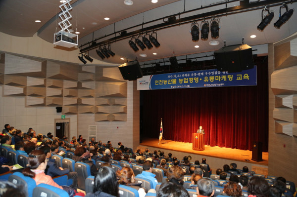 경기 연천군은 지역에서 생산하는 단호박·대추·딸기·배·블루베리·사과·아로니아 등의 품질고급화와 농가 소득향상을 위해 13일 연천수레울아트홀 소공연장에서 ‘과수농가 경영관리 유통 컨설팅 교육’을 진행했다. 사진은 청강하고 있는 과수농가 관계자들의 모습. (사진제공=연천포토)
