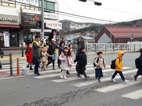 경기 용인시 기흥구 상하동은 새학기를 맞아 어린이들의 안전한 등굣길 조성을 위해 최근 상하·지석초교 등 2개 초등학교 앞에서 교통안전 캠페인을 실시했다. 사진은 어린이들이 횡단보도를 건너고 있는 모습. (사진제공=용인시청)
